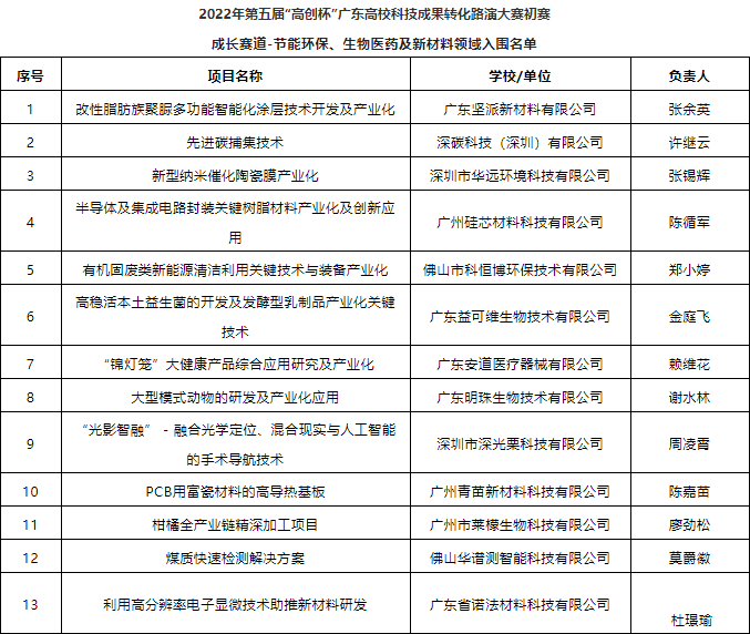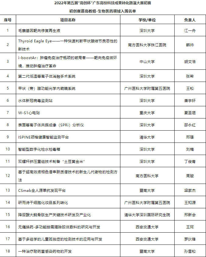 以下為2022年第五屆“高創(chuàng)杯”廣東高校科技成果轉(zhuǎn)化路演大賽入圍初賽項目名單