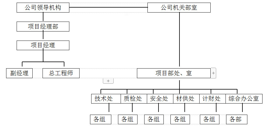 項(xiàng)目部實(shí)行項(xiàng)目經(jīng)理負(fù)責(zé)制,設(shè)項(xiàng)目經(jīng)理一名,對(duì)現(xiàn)場(chǎng)施工、經(jīng)營(yíng)、人事負(fù)責(zé)任;設(shè)項(xiàng)目副經(jīng)理、技術(shù)總負(fù)責(zé)(項(xiàng)目總工)各1人負(fù)責(zé)工程施工調(diào)度、工程技術(shù)、質(zhì)量、安全監(jiān)控分項(xiàng)工作;項(xiàng)目部下設(shè)“五處一室”,各處室按照職責(zé)行使管理職能。
